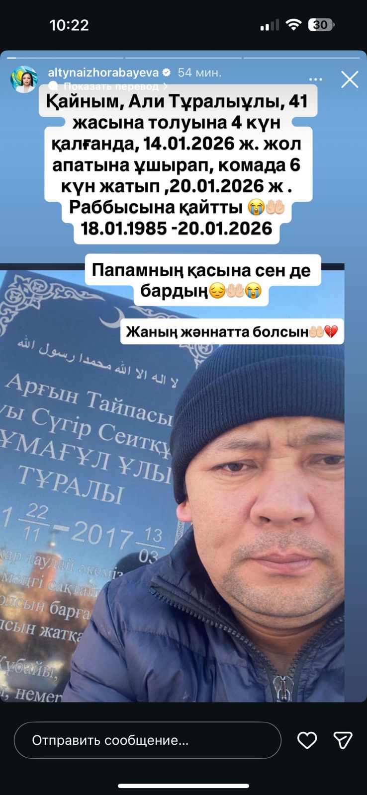 — «Қайным, Әли Тұралыұлы, 41 жасына толуына 4 күн қалғанда жол апатына ұшырап, 6 күн комада жатып, Раббысына қайтты. Папамның қасына сен де бардың… Жаның жәннатта болсын», — деп жазды Алтынай Жорабаева.