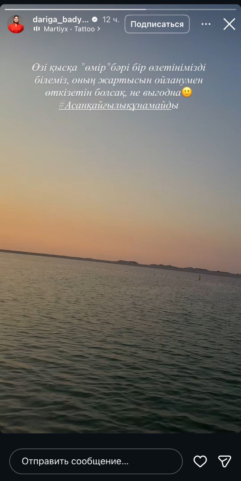 Теңіз жағасында демалыста жүрген актриса ой саларлық жазба қалдырған. Ол өмірге жарқын көзқараспен қарағанды құптайтынын білдірген.