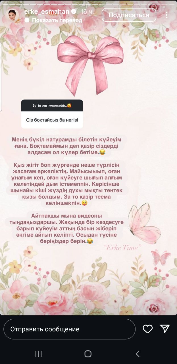 «Менің бүкіл болмысымды күйеуім ғана біледі. Боқтамаймын десем, сіздерді алдағандай боламын. Ол да бетіме қарап күледі. Қыз-жігіт болып жүргенде еркеліктің неше түрлісін жасадым. Майысып, оған ұнағым келіп ештеңе істемеппін. Керісінше шынайы кіші жүздің рухы мықты, тентек қызы болдым. Қазір керемет келіншекпін», – деп жазды ол.