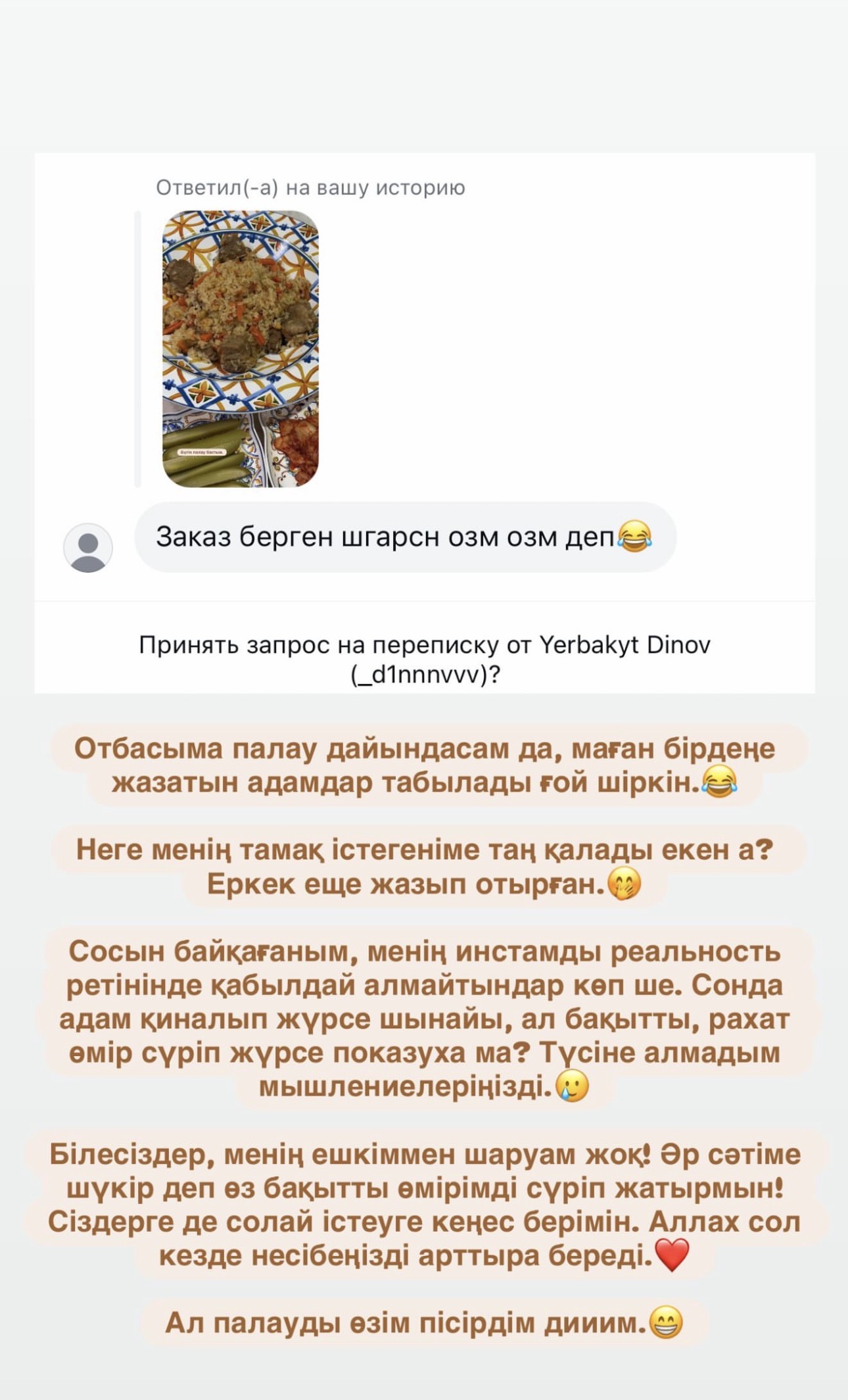 Әнші отбасысына палау дайындағанын бөліскеннен кейін, желіде «Палауды өзің емес, заказбен алдырған шығарсың» деген күмәнді пікір қалдырылғанын айтты. Өнер иесі мұндай көзқарасқа таң қалғанын жасырмады.