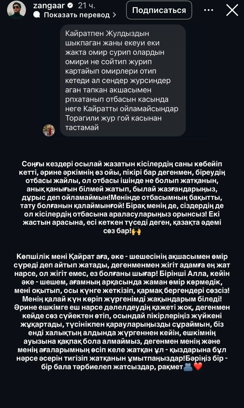 Қайрат Нұртастың інісі Занғар әлеуметтік желіде отбасына қатысты айтылған кейбір жағымсыз пікірлерге жауап берді, деп хабарлайды POLITICO.KZ.