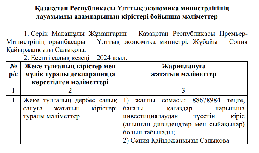 Ресми құжатқа сәйкес, Премьер-министрдің орынбасары — Ұлттық экономика министрі Серік Жұманғариннің жұбайы Сәния Садықова 2024 жылда 88 миллион 678 мың 984 теңге табыс тапқан. Бұл қаржының негізгі көзі ретінде бағалы қағаздар нарығына салынған инвестиция көрсетілген. Оған нарықтан алынған дивидендтер мен сыйақылар кіреді.