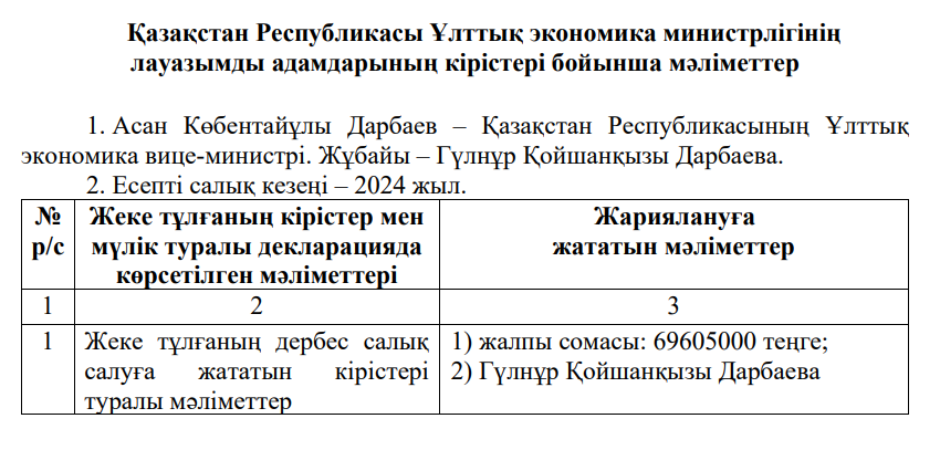 Ведомстводағы тағы бір жоғары лауазымды тұлға, Ұлттық экономика вице-министрі Асан Дарбаевтың отбасылық бюджеті де назарға ілікті. Шенеуніктің жұбайы Гүлнұр Дарбаева 2024 жылы 69 миллион 605 мың теңге көлемінде қаржы тапты. Сәния Садықовадан айырмашылығы, Гүлнұр Қойшанқызының тапқан табысының нақты көзі декларацияда көрсетілмеген.