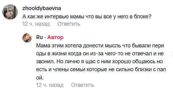 «Анам сұхбатта әкемнің кей кездері белгілі бір себептермен бізбен хабарласпай, сөйлеспей жүрген сәттері болғанын айтқысы келді. Өз басым қазір әкеммен жақсы араласамын, бірақ отбасымызда онымен аса жақын емес адамдар да бар», – деп жауап берген ол.