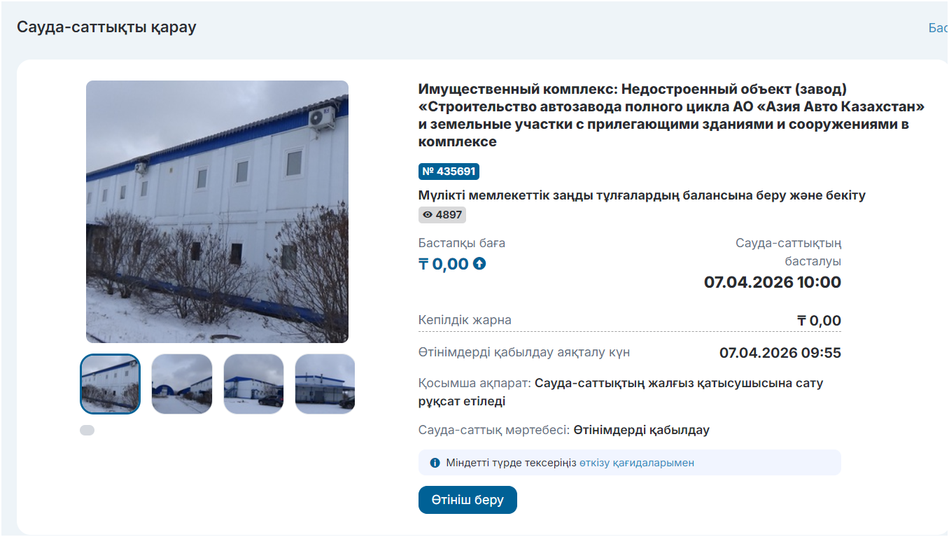 Мемлекеттік мүлік және жекешелендіру департаменті саудаға шығарған ірі лоттың қатарына құрылысы аяқталмаған «Азия Авто Қазақстан» зауытынан бөлек жер телімдері мен ғимараттар кіреді. Сауда 7 сәуірге белгіленген.
