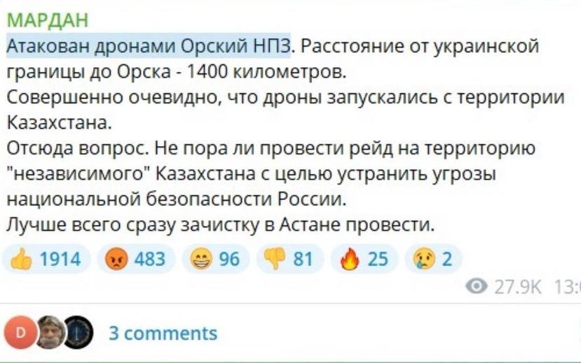 Мардан бұл шабуылдардың Украина шекарасынан 1400 шақырым қашықтықта орналасқандықтан, дрондардың Қазақстан аумағынан ұшырылғаны анық деп мәлімдеген. Ол ешқандай дәлелсіз, ашықтан-ашық: