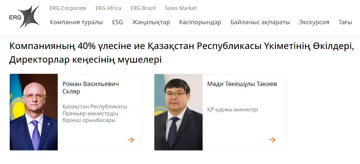 «Компанияның 40% үлесіне ие Қазақстан Республикасы Үкіметінің Өкілдері, Директорлар кеңесінің мүшелері: Роман Васильевич Скляр, Мәди Төкешұлы Такиев», – делінген ERG команиясының сайтындағы Менеджмент бөлімінде.