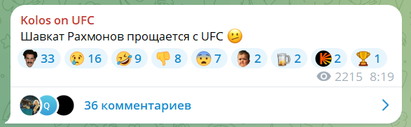Ресейлік Telegram-арналарда қазақстандық файтер Шавкат Рахмоновтың UFC ұйымынан кететіні туралы ақпарат тарады. Бұл қауесетке қатысты спортшының командасы пікір білдірді.