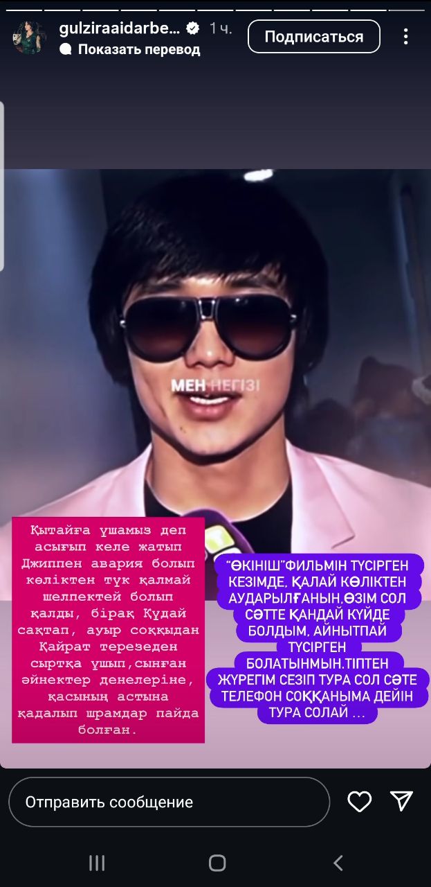 «Қытайға ұшамыз деп асығып келе жатып, жол апатына ұшырадық. Көліктен түк қалмай, шелпек болып қалды. Бірақ құдай сақтап қалды. Қайрат терезеден ұшып кетті. Әйнектер сынып, денесі мен көзіне қадалып қалды. Содан тыртық пайда болды. Көзілдірікті сол үшін тағып шығатын», – деп жазды продюсер.