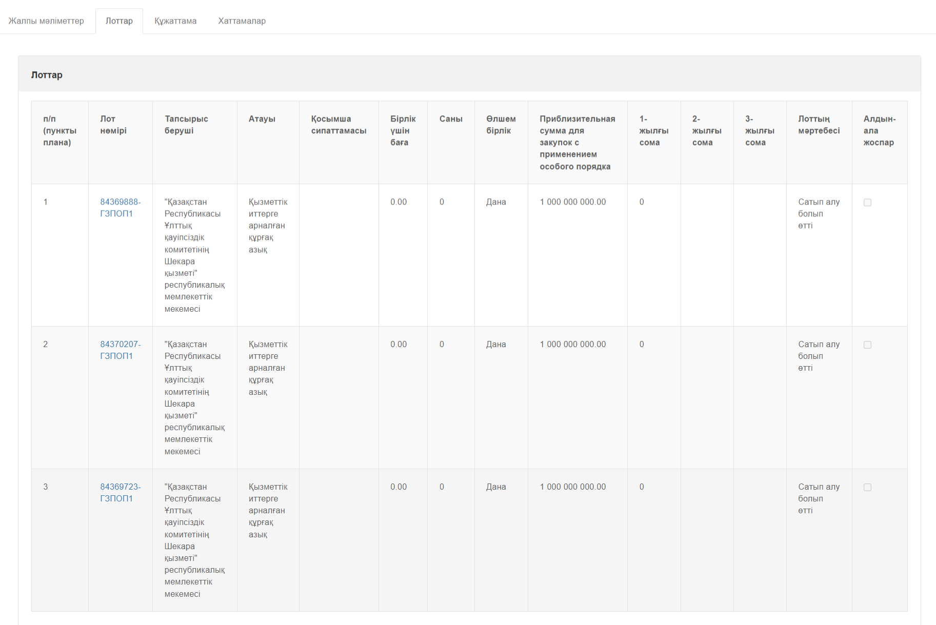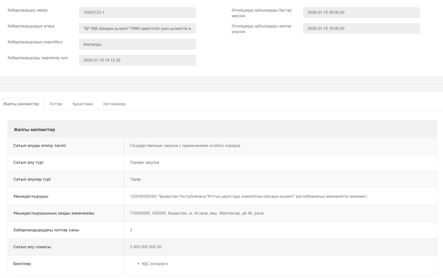 Бұл ірі көлемдегі лотқа алғашқылардың бірі болып PROTENGE телеграм арнасы назар аударды. Редакциямыз мемлекеттік сатып алу порталын тексеріп, ақпараттың растығына көз жеткізді. Расында да, сайтта "ҚР ҰҚК Шекара қызметі" РММ мұқтаждығы үшін қызметтік иттерге арналған құрғақ азықты мемлекеттік сатып алу конкурсы өткені расталды.