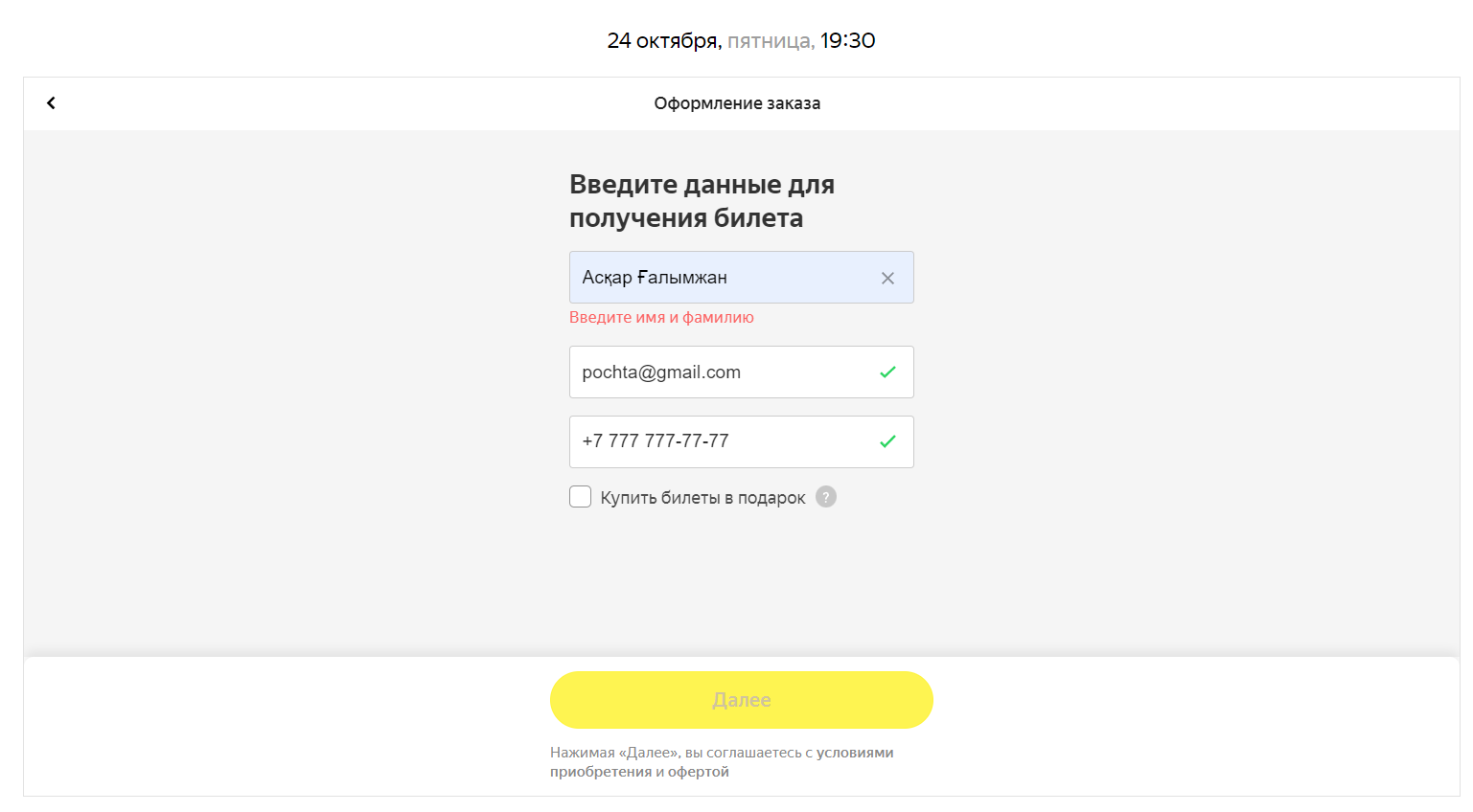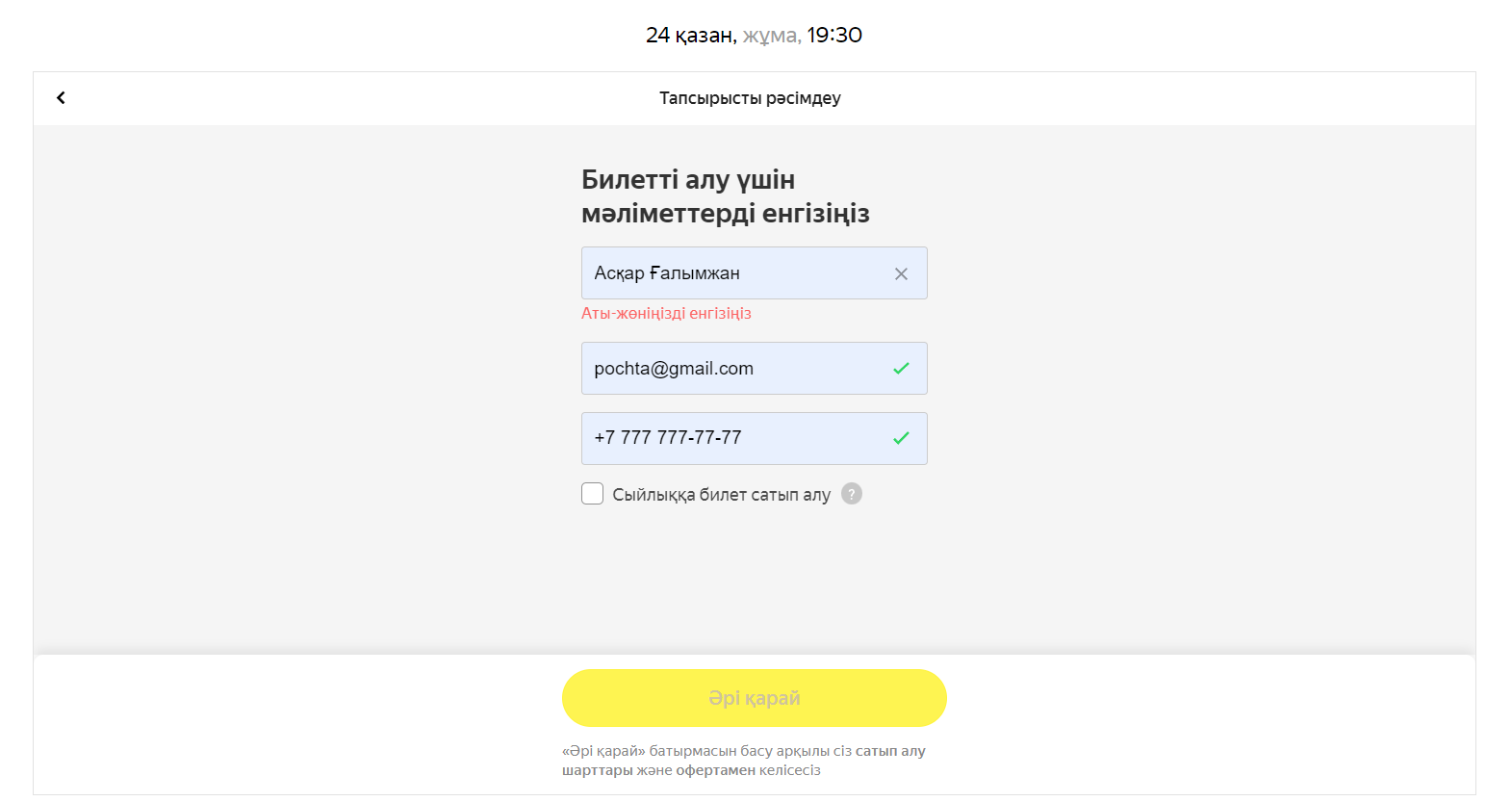 Астана. 19 қазан. Редакциямыз afisha.yandex.kz сайты арқылы билет рәсімдеу барысында келеңсіз жағдайды байқады. Есімі мен тегінде қазақ әріптері бар пайдаланушылар билет сатып ала алмайды.