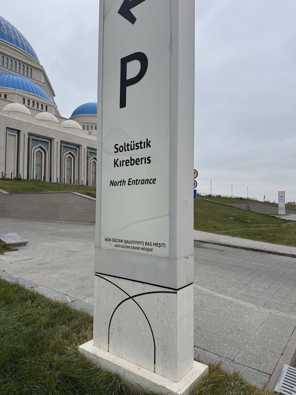 Тақтада латын әріптерімен «НҰР-СҰЛТАН ҚАЛАСЫНЫҢ БАС МЕШІТІ» деп анық жазылған.