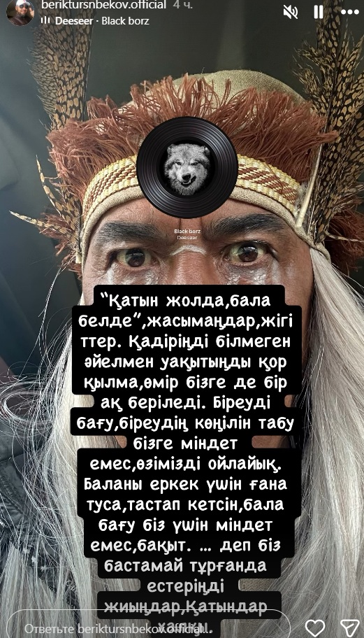 «Қатын жолда, бала белде», жасымаңдар жігіттер. Қадіріңді білмеген әйелмен уақытыңды қор қылма, өмір бізге де бір рет беріледі. Біреуді бағу, біреудің көңілін табу бізге міндет емес, өзімізді ойлайық. Баланы еркек үшін ғана туса, тастап кетсін. Бала бағу біз үшін міндет емес, бақыт деп біз бастамай тұрғанда естеріңді жиыңдар, қатындар халқы», — деп жазды Берік Тұрсынбеков.