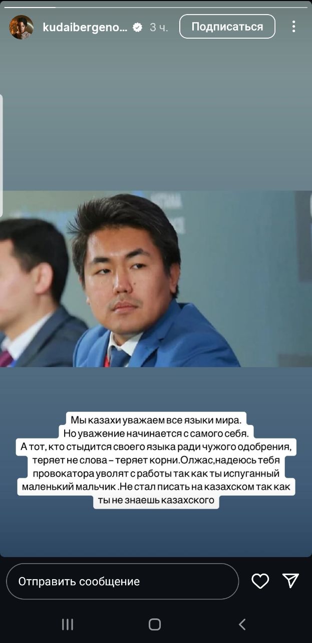 «Біз қазақтар әлемнің барлық тілін құрметтейміз. Бірақ сыйластық алдымен өзіңнен басталуы керек. Ал өзгенің мақтауы үшін өз тілінен ұялатындар сөзінен емес тамырынан айырылады. Олжас, сен сияқты арандатушыны шығарады деп үміттенемін, себебі сен кішкентай қорқақ баласың. Қазақ тілінде әдейі жазбадым, себебі сен қазақша түсінбейсің», – деді ол.