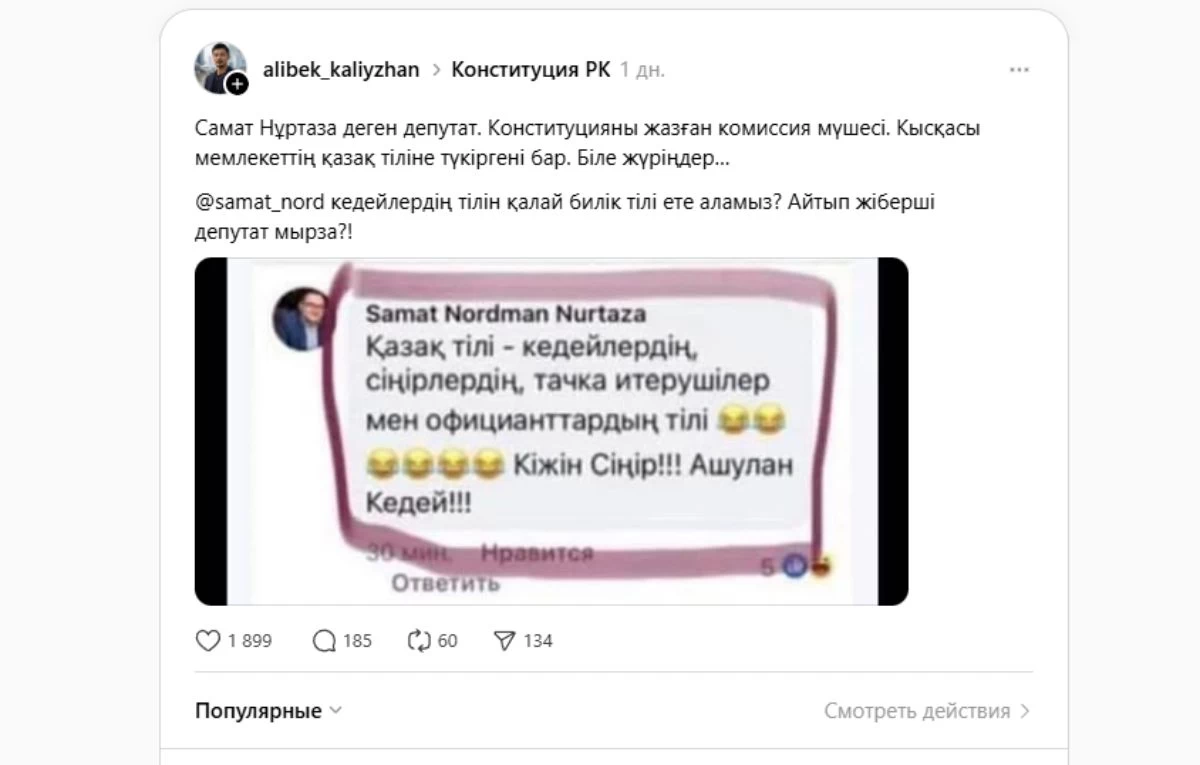 «Кедейлер мен даяшылардың тілі»: Депутат Самат Нұртазаның жазбасы дау тудырды