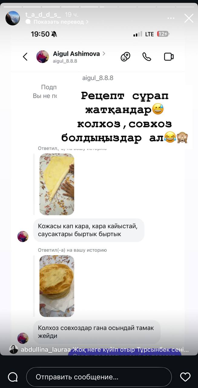 Айман Instagram парақшасына қамыр илеп, қаттама дайындап жатқан сәтін жай ғана бөліскен еді. Бірақ бір оқырман оның еңбегін бағалаудың орнына, ауыр сөзбен түйреп өтті.
