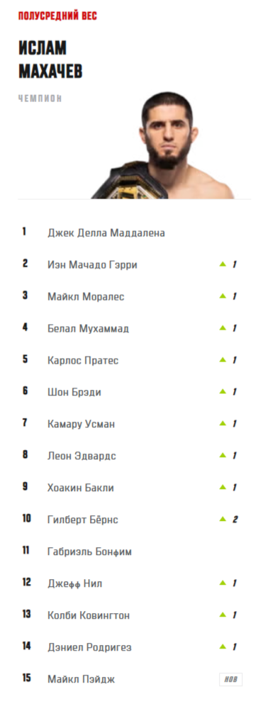 UFC-дің соңғы мәліметтеріне сәйкес, жартылай орта салмақтағы үздік 15 файтердің тізімінде айтарлықтай өзгерістер орын алды. Осы уақытқа дейін рейтингтің екінші сатысында тұрған қазақстандық спортшы Шавкат Рахмонов топ-15 тізімінен толықтай шығарылды.