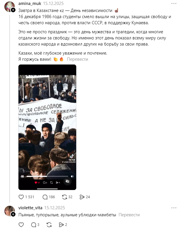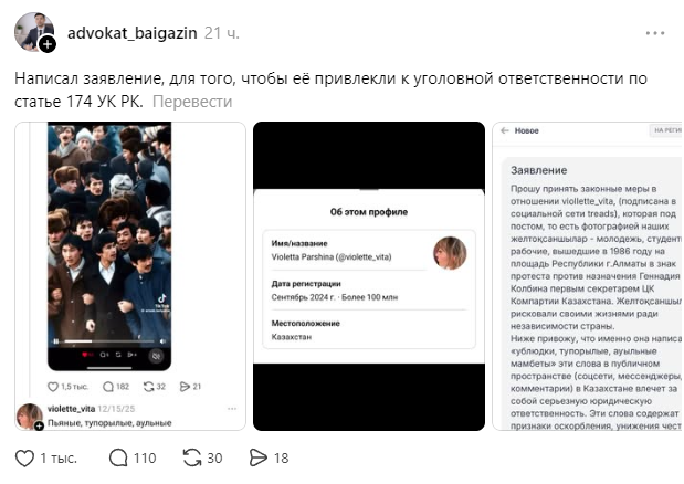 Алматы тұрғыны Threads әлеуметтік желісінде қазақ халқына, Желтоқсан құрбандарына және Қазақстан мемлекетіне тіл тигізіп, үлкен даудың ортасында қалды, деп хабарлайды Politico.kz.